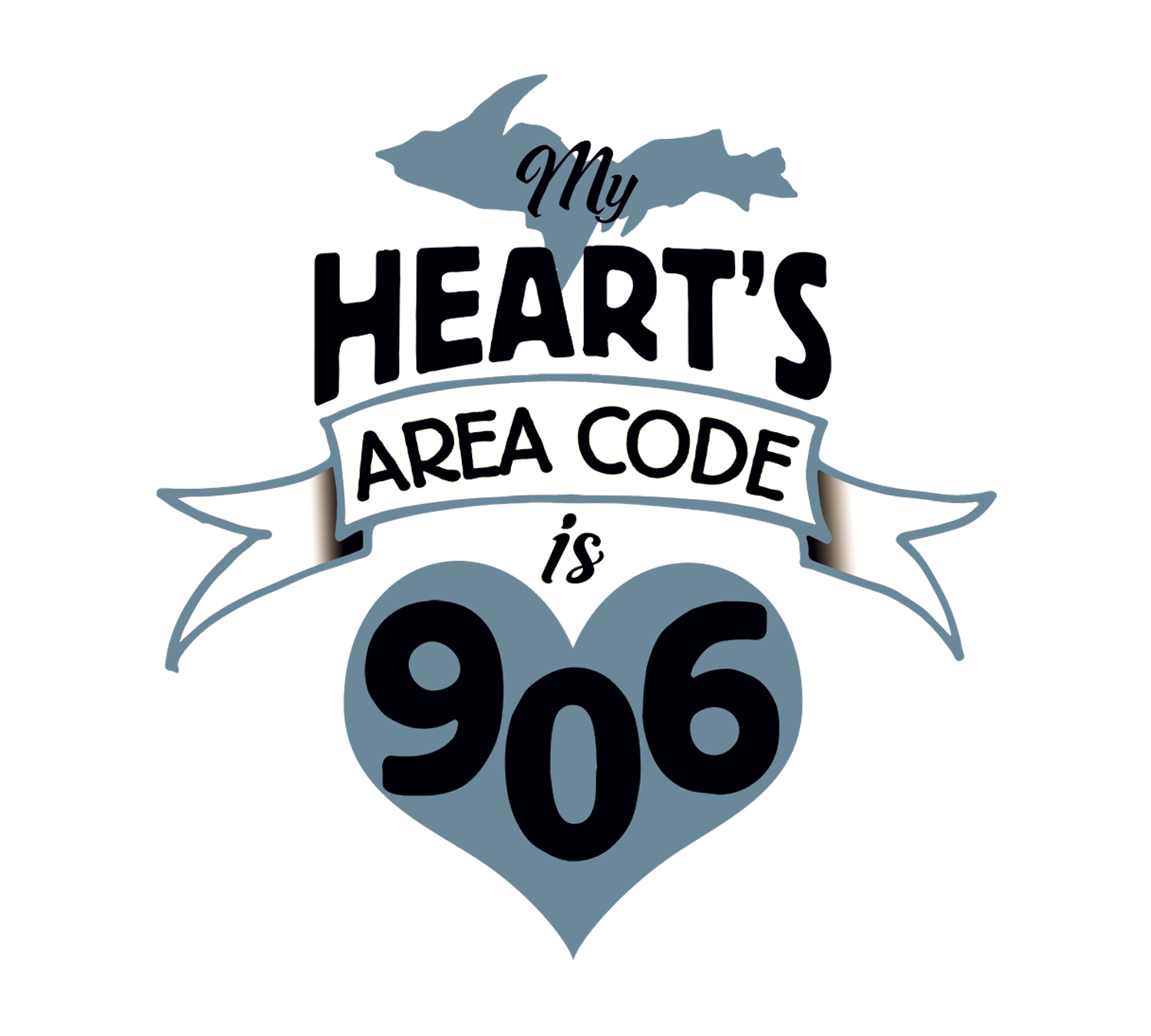 U.P. sticker features the words "My Heart's Area Code is 906" with the shape of the Upper Peninsula of Michigan and a heart and ribbon.