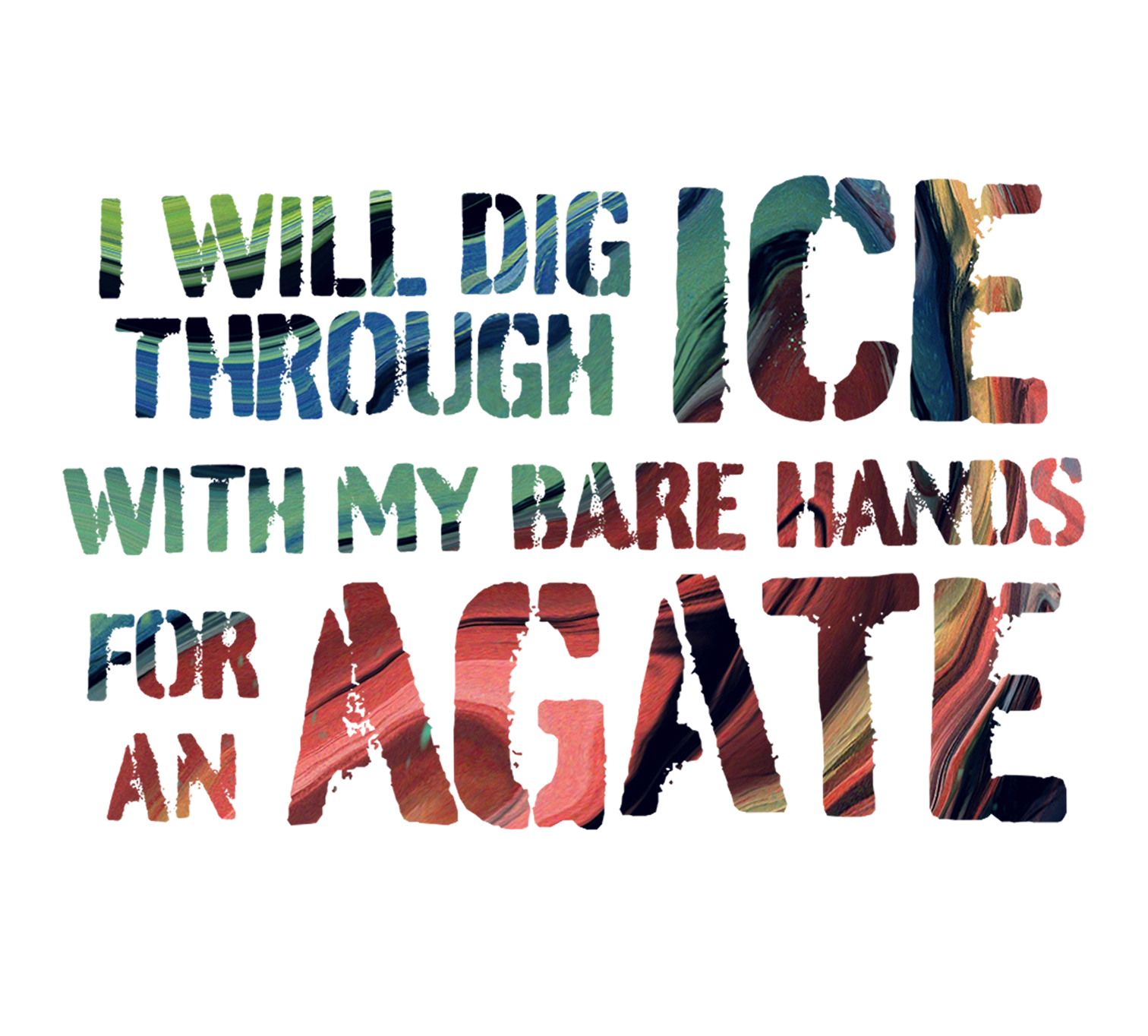 Rockpicking magnet features the words "I Will Dig Through Ice With My Bare Hands For An Agate" with an agate design behind the letters.
