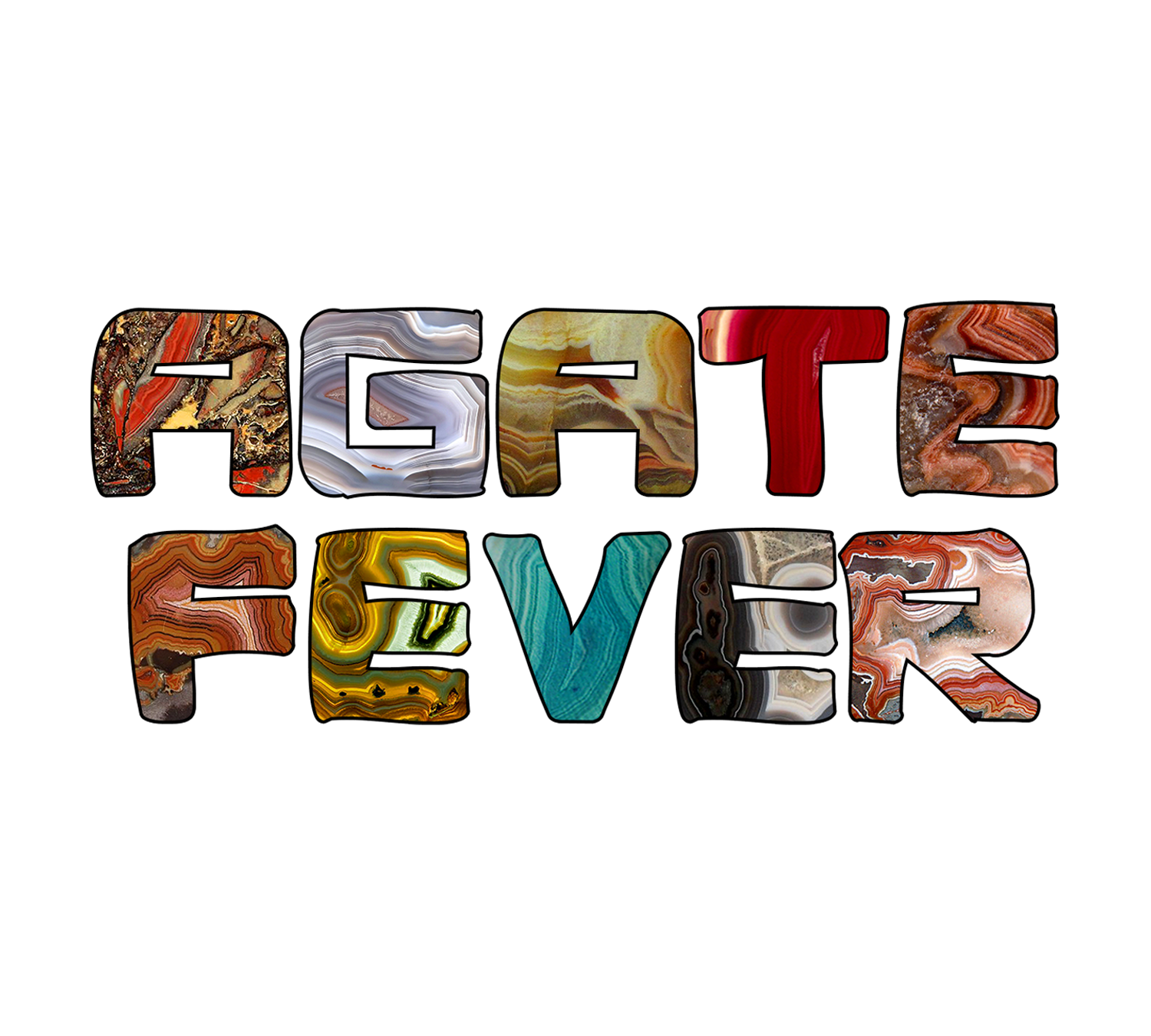 Rockhound sticker features the words "Agate Fever" with a variety of agate designs, one behind each letter.