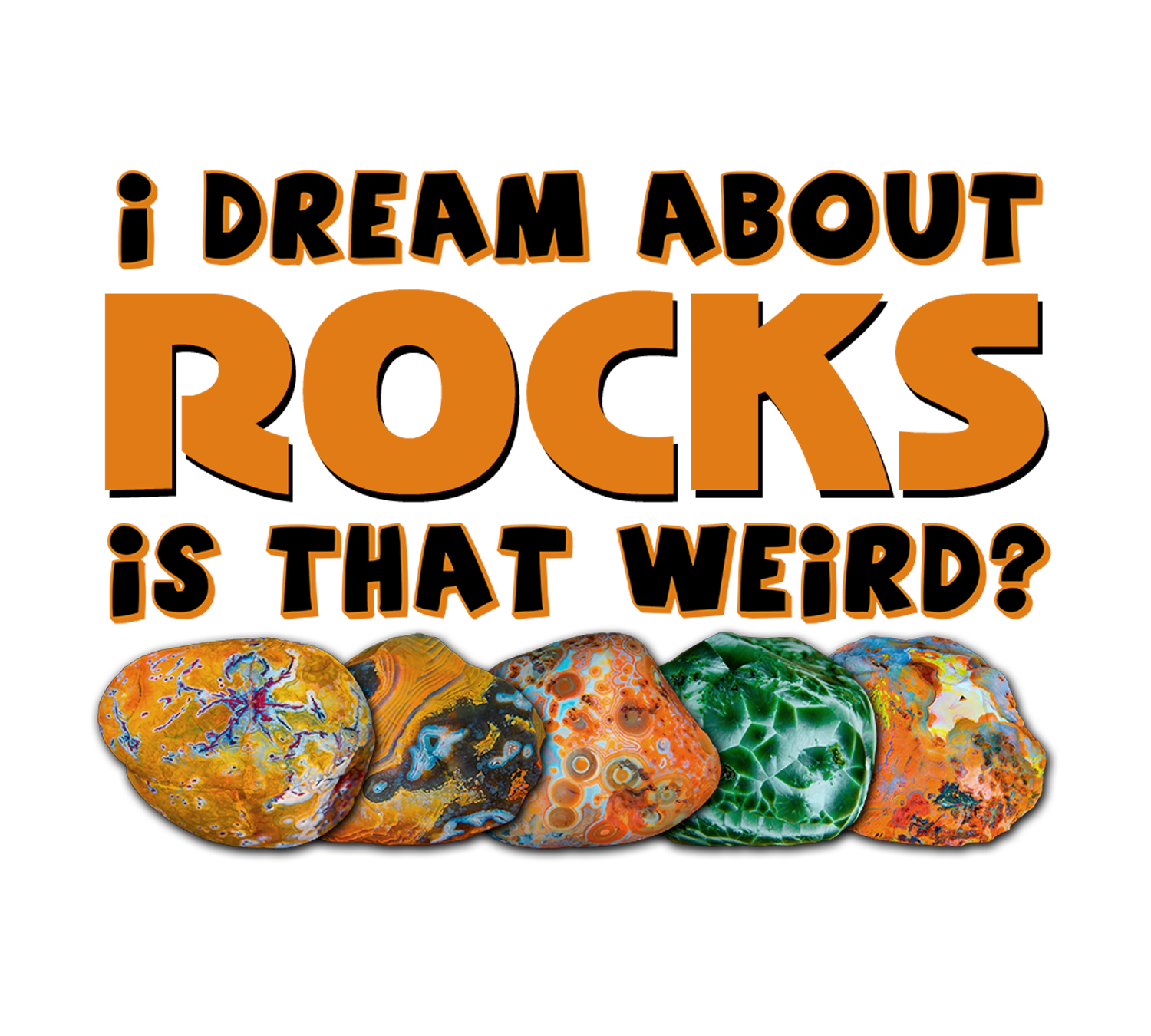Rock lovers will identify with the words "I Dream About Rocks, Is That Weird?" along with 5 gorgeous agates lined up underneath.