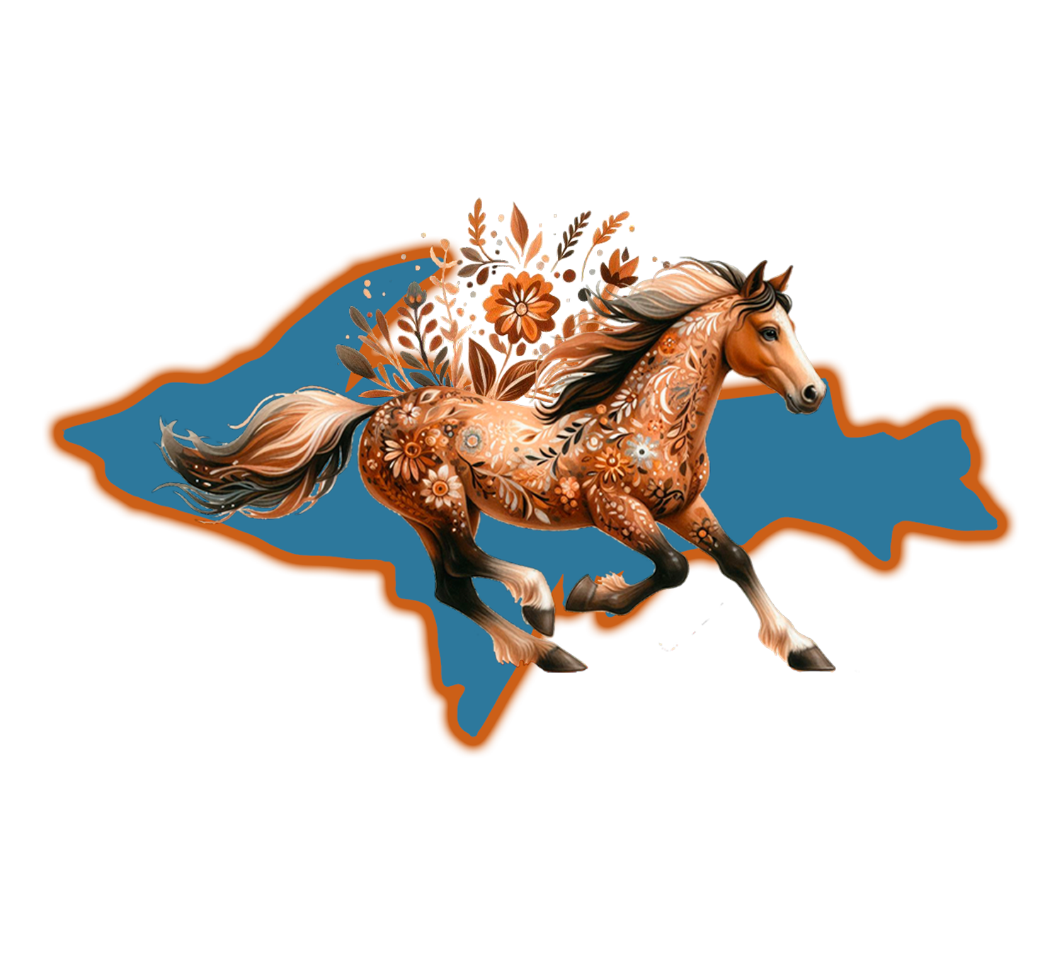 Design features a beautiful boho flowery horse running across the Upper Peninsula of Michigan. Color scheme is blues, browns, and oranges.