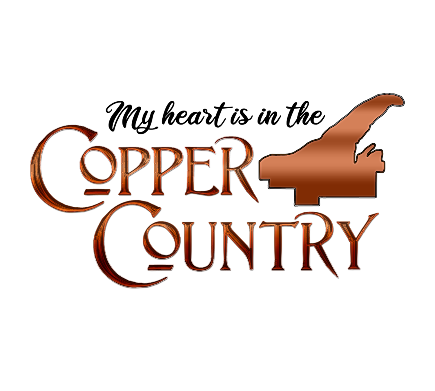 Keweenaw magnet features the words "My Heart is in the Copper Country" next to the shape of the four counties that make up the Keweenaw Peninsula: Keweenaw, Houghton, Ontonagon, and Baraga, all in a coppery color.