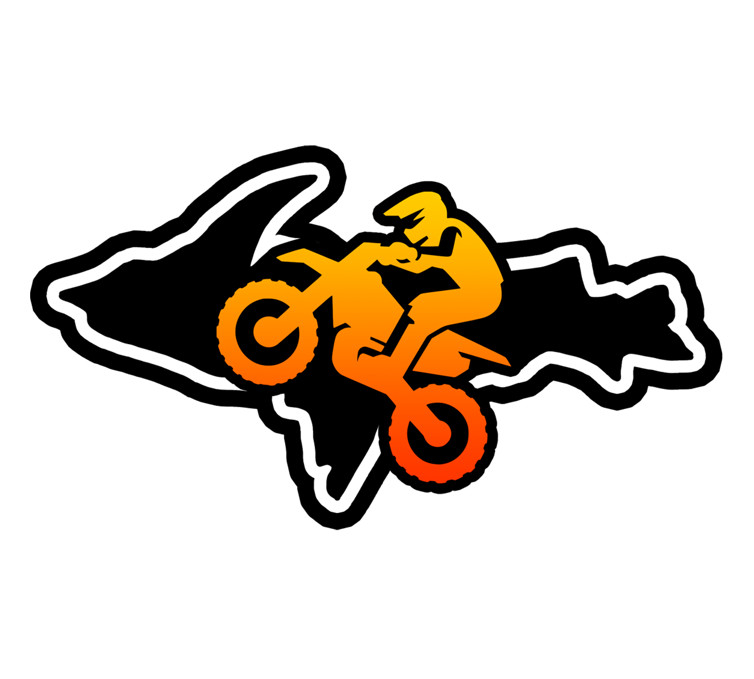 Design features a dirt biker in orange and red doing a wheelie against the shape of the Upper Peninsula of Michigan.