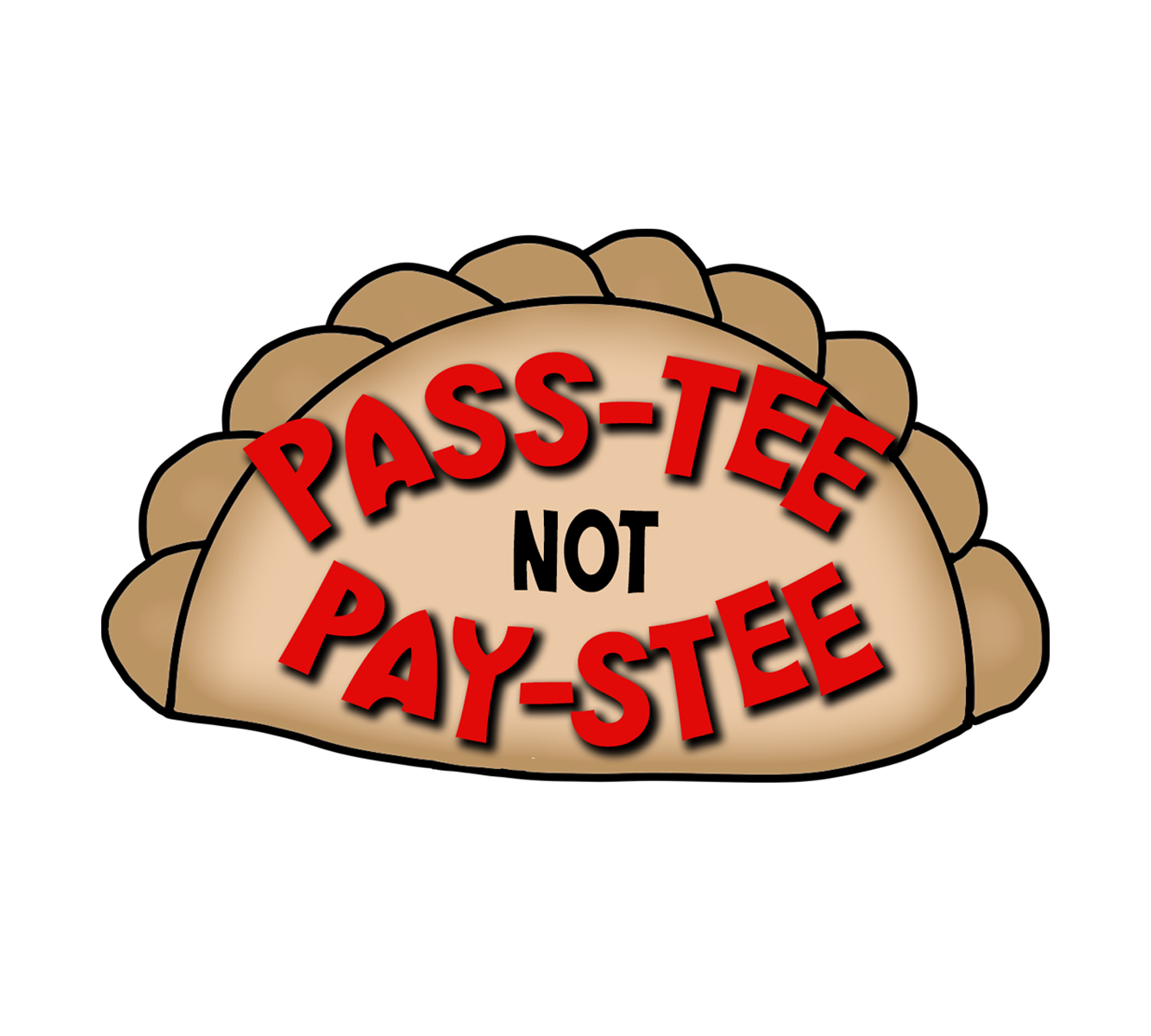 The pronunciation of pasty is an ongoing point of confusion. This magnet features the words "Pass-tee not Pay-stee" on a pasty graphic. Pay-stee is a whole 'nother thing!