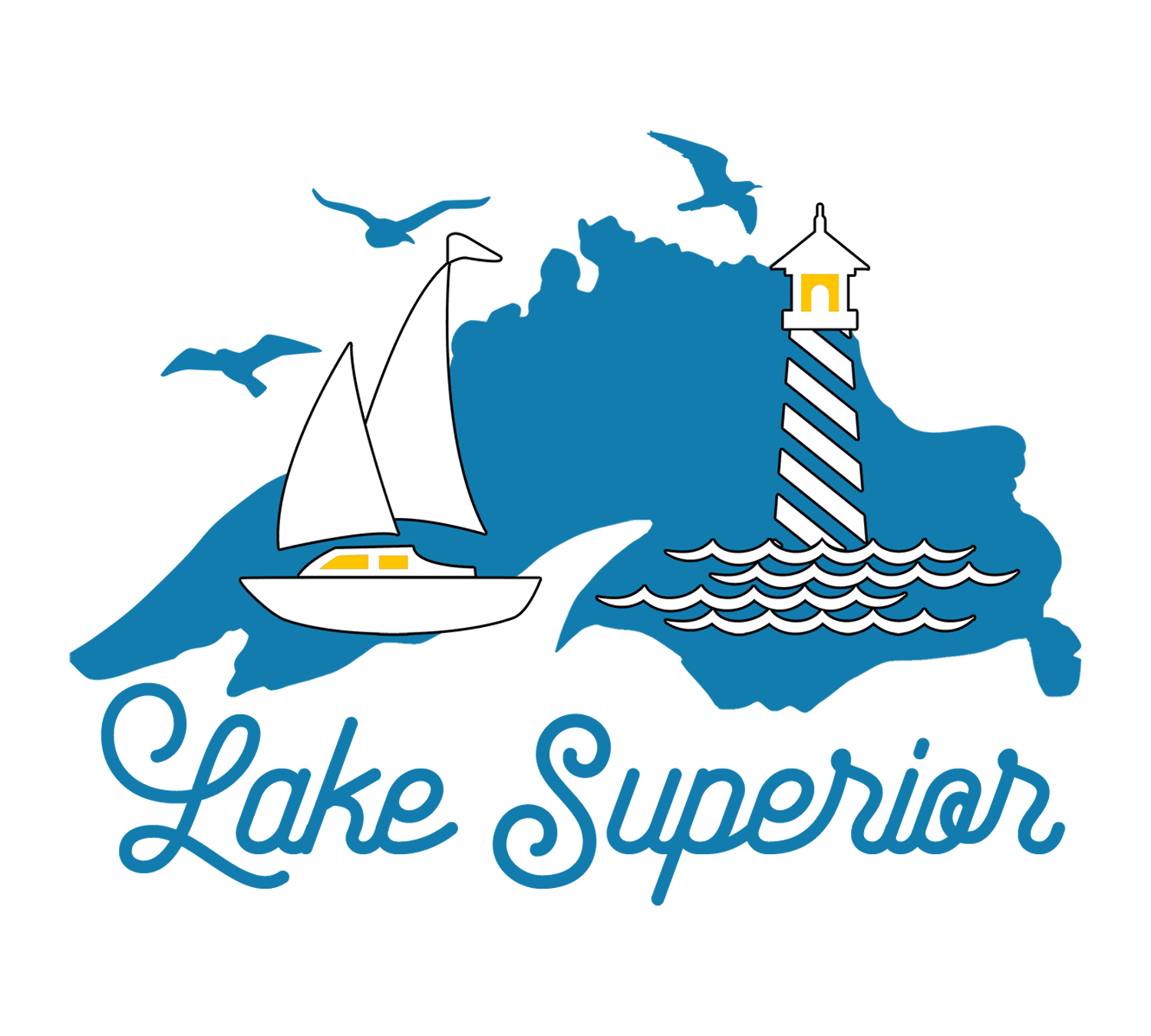 This Great Lake magnet features the words "Lake Superior" underneath the shape of the lake and a boat, waves, lighthouse, and seagulls.