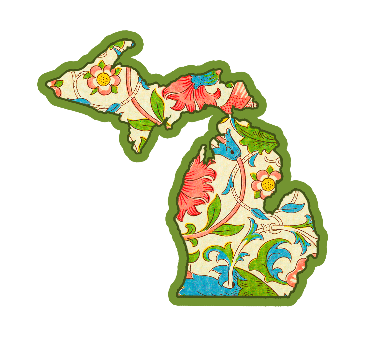 Design features Upper and Lower Michigan filled with vintage floral wallpaper in pinks, greens, and blues on a cream-colored background.