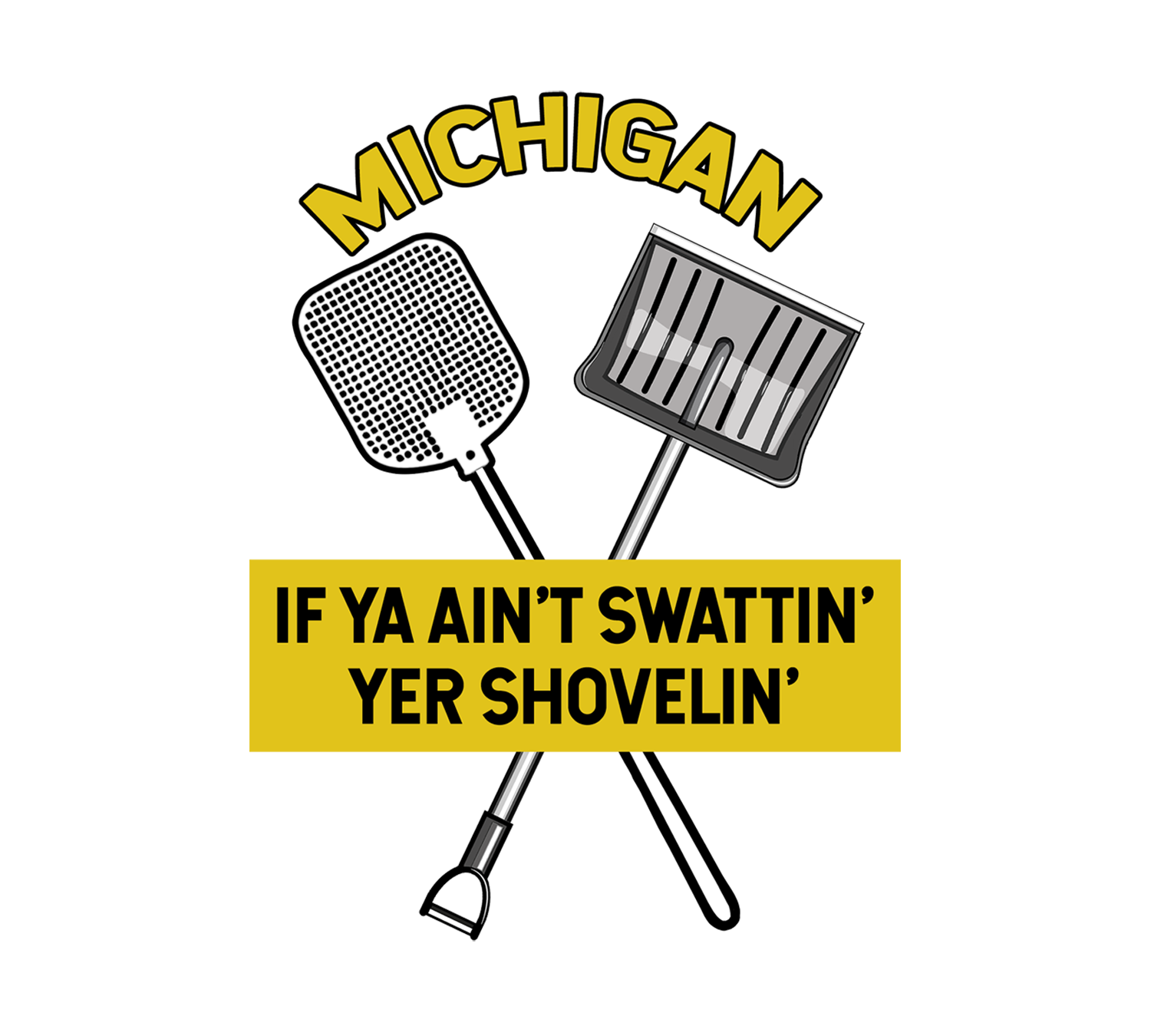 Design features the words "Michigan - If ya ain't swattin' yer shovelin'" with a shovel and a flyswatter crisscrossed. Colors are yellow and black.