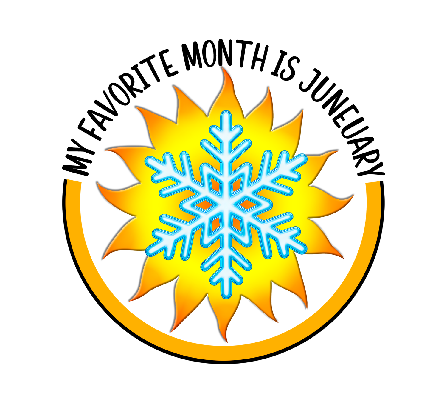 Design features a sun and a snowflake in a circle and the words "My Favorite Month is Juneuary." We all know either one can happen in either month!
