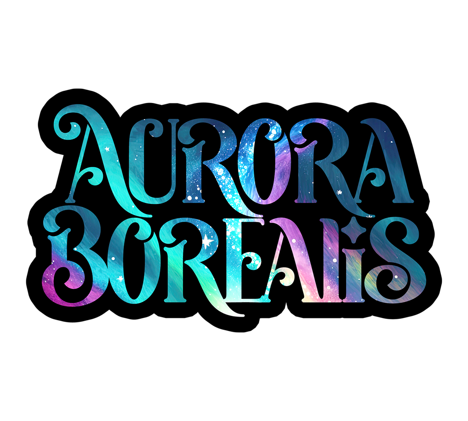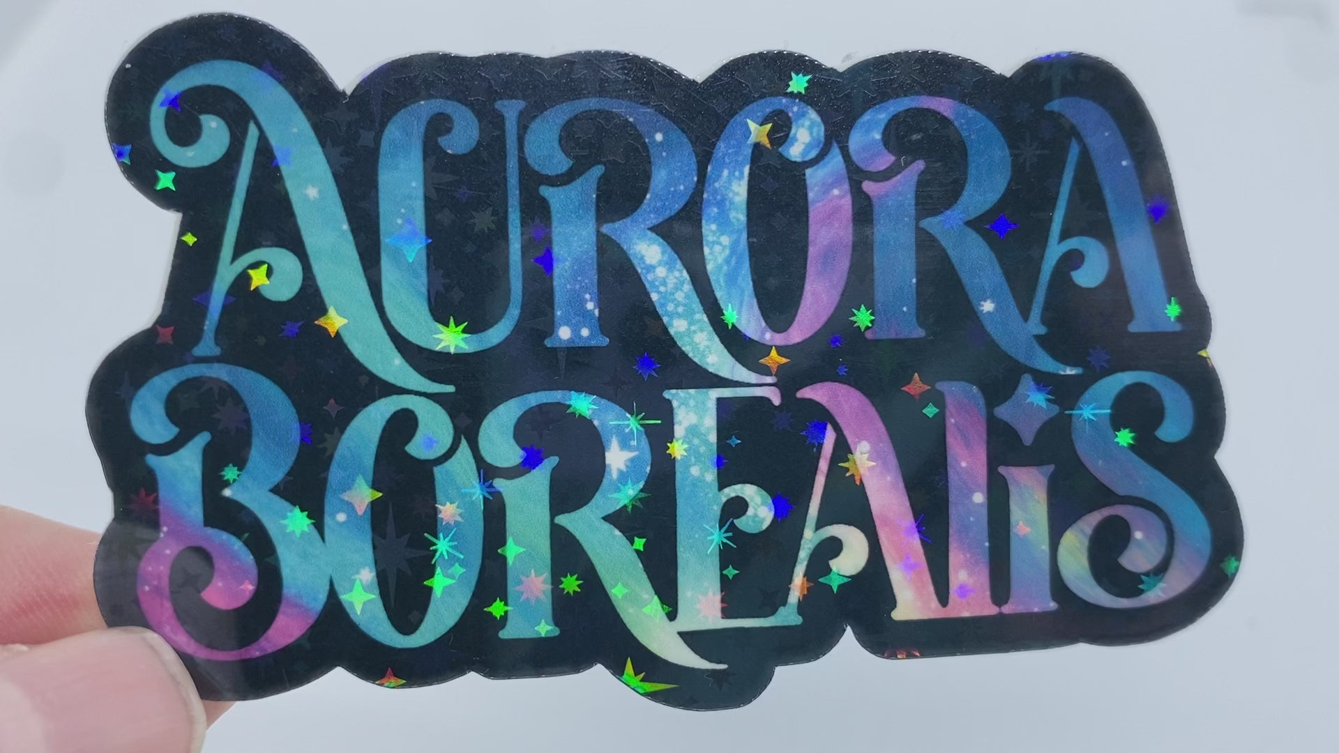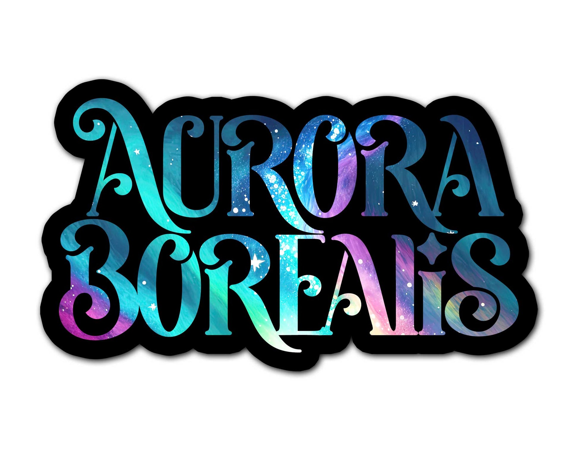 Northern lights sticker features the words "Aurora Borealis" with green, blue, pink, and purple northern lights in the background. Laminated with holographic sparkle laminate for extra glow! (Or you can choose regular laminate.)