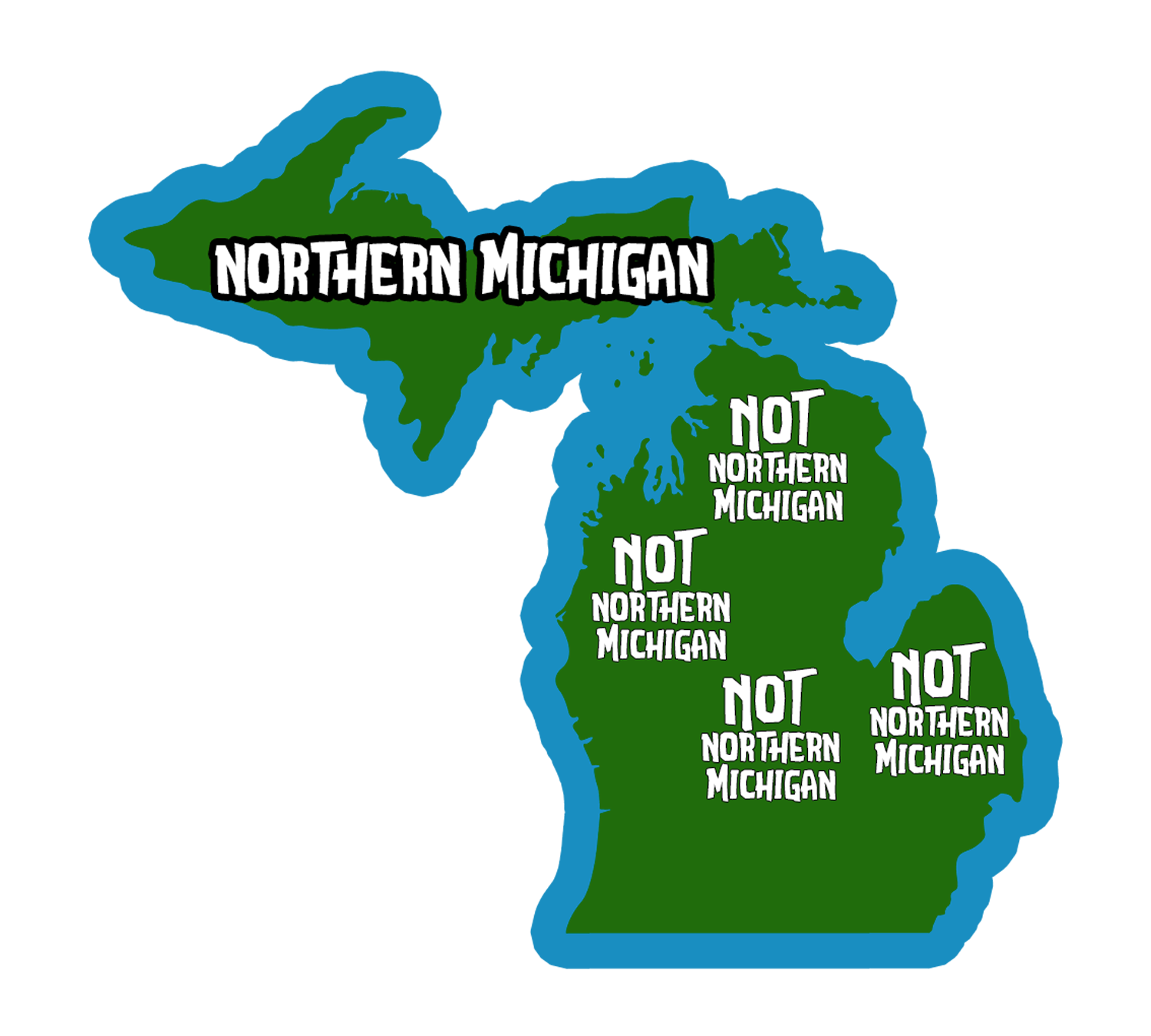 Sticker features both the Upper and Lower Peninsulas of Michigan in green and outlined in blue showing all the areas that are NOT northern Michigan and the one area that IS. All in good fun, of course.