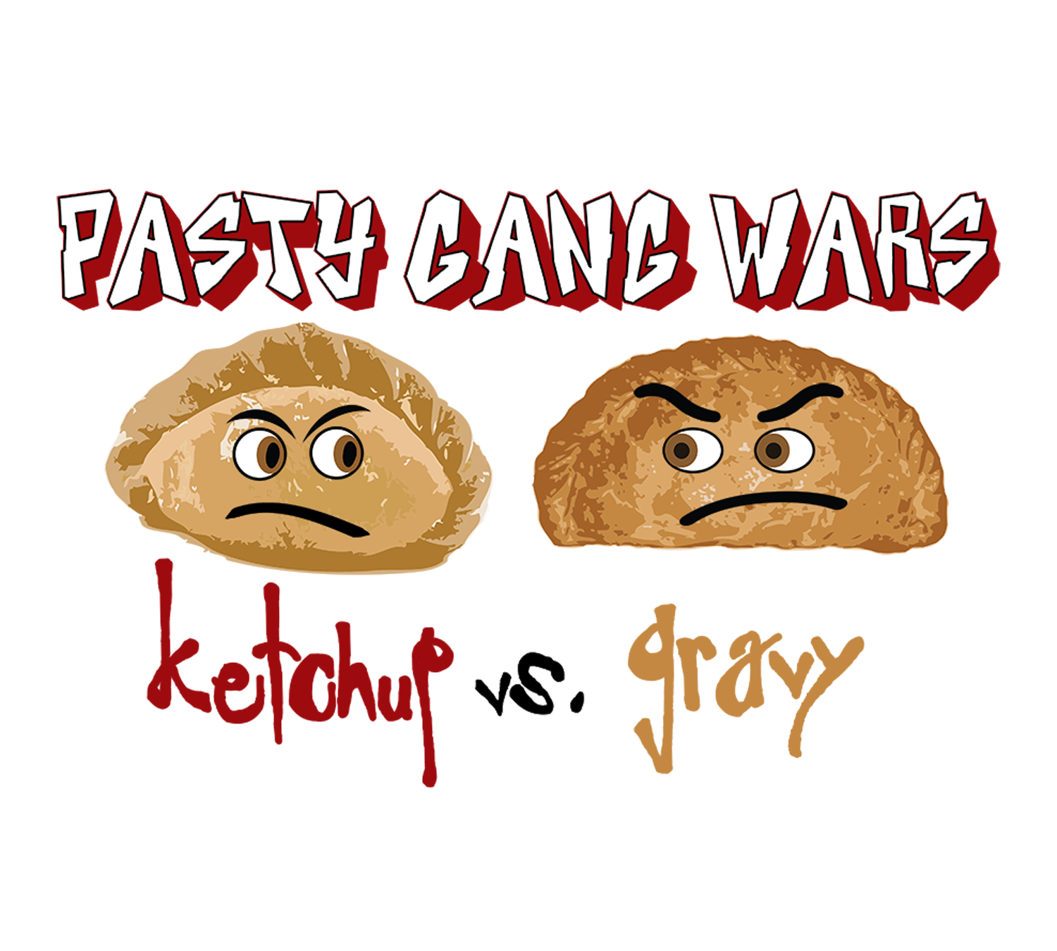 Funny pasty sticker features the words "Pasty Gang Wars - Ketchup vs. Gravy" with a graphic of two pasties glaring at each other.