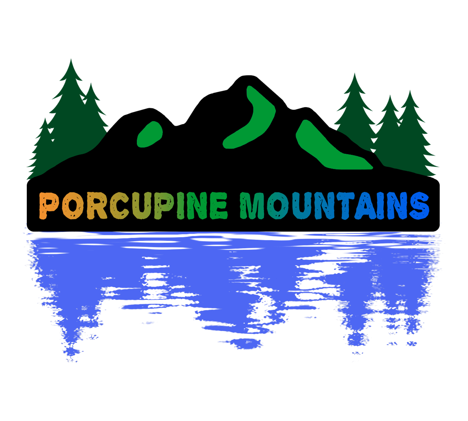 Porkies sticker features the words "Porcupine Mountains" and pictures mountains, trees, and water.