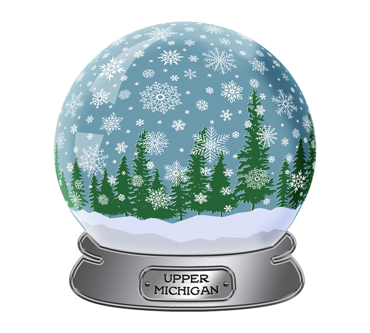 Upper Peninsula magnet features the words "Upper Michigan" on a silver snow globe, with pine trees and falling snow inside. It is protected by a beautiful holographic sparkle laminate.