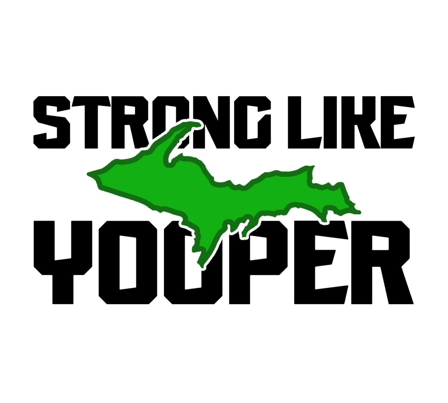U.P. sticker features the words "Strong Like Yooper" with the shape of the Upper Peninsula of Michigan.