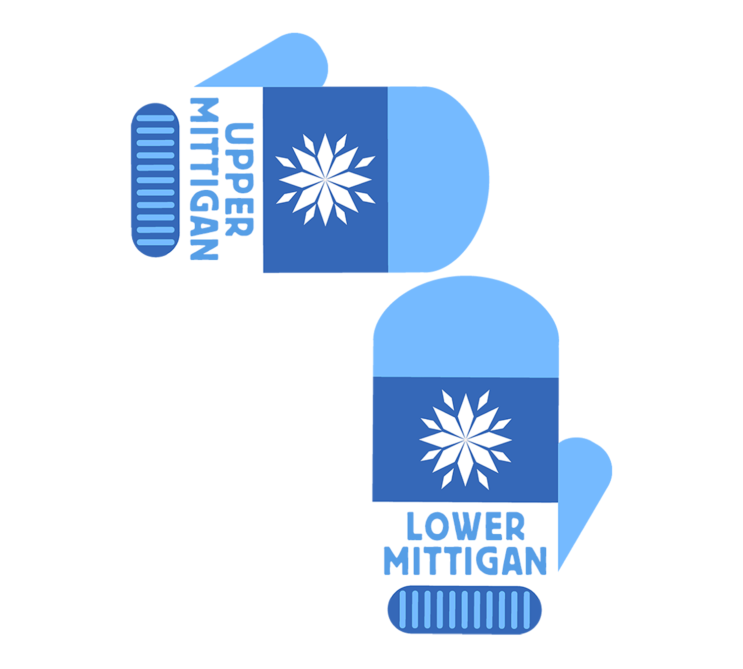 U.P. magnet features the words "Upper Mittigan" and "Lower Mittigan" with blue winter mittens for the Upper and Lower Peninsulas of Michigan.