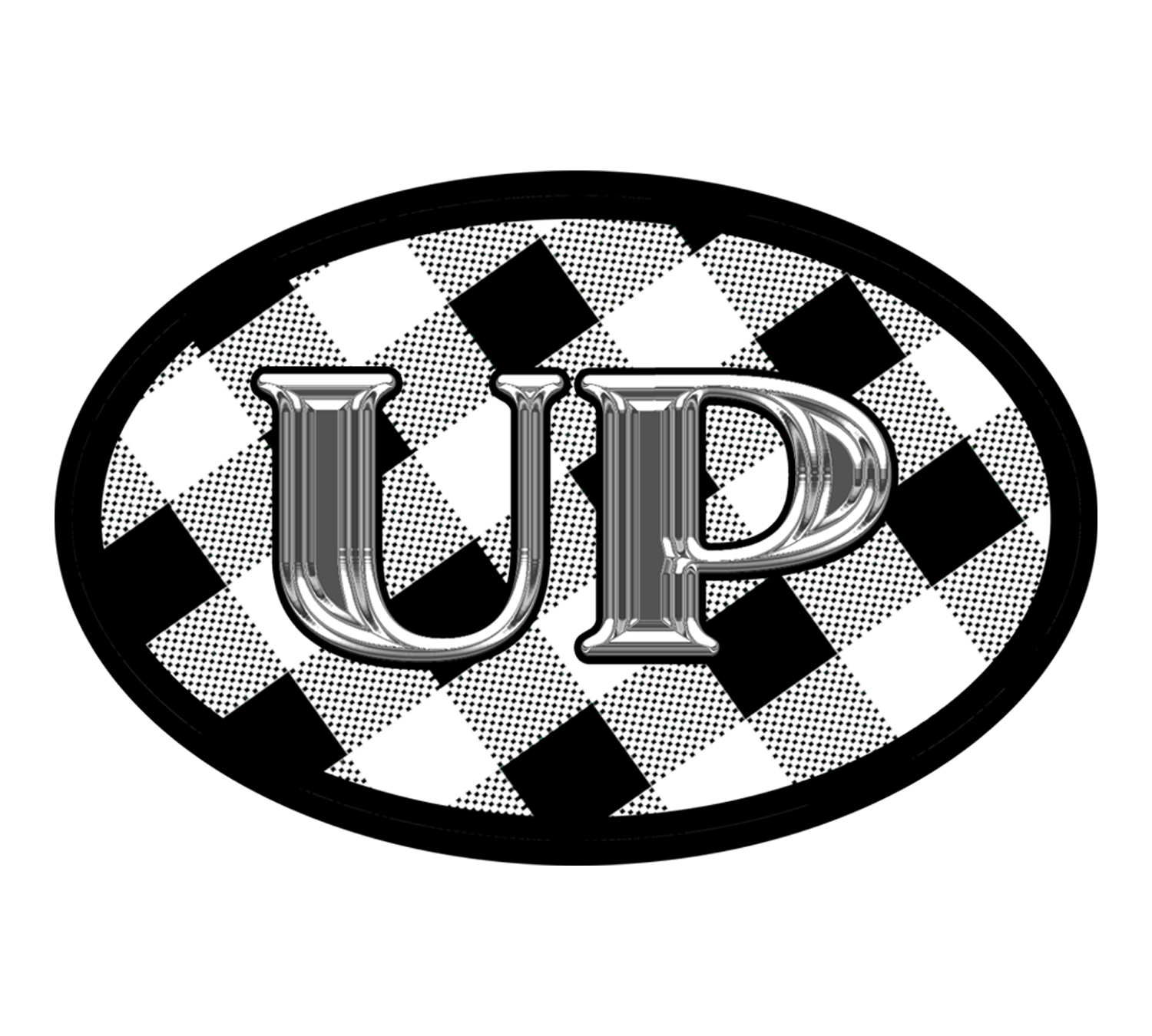UP Sticker, Upper Michigan on Black and White Buffalo Plaid Oval