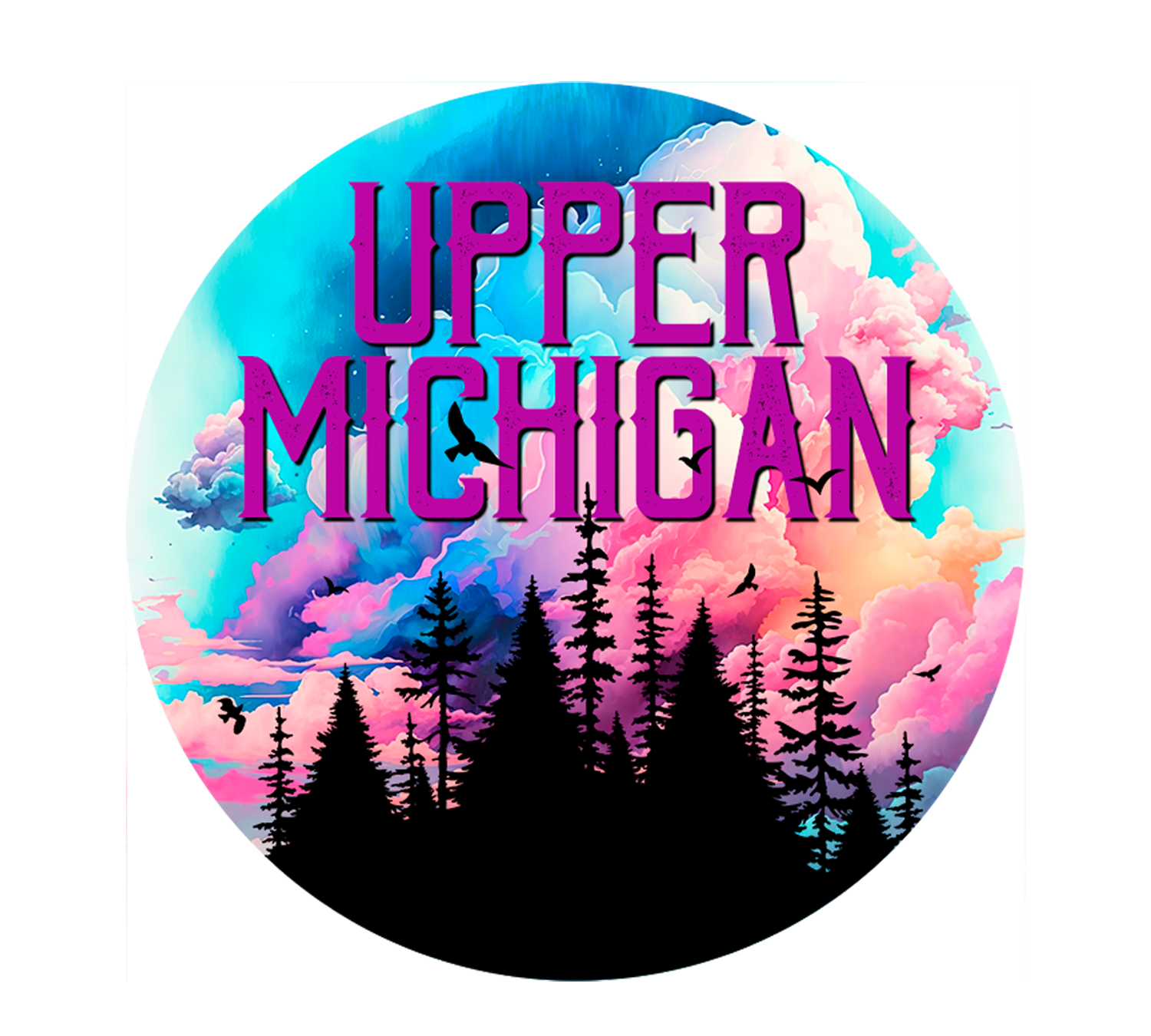 Circular sticker features the words "Upper Michigan" above a forest of pine trees and birds flying, all set against beautiful "cotton candy" clouds of pink, purple, and blue.