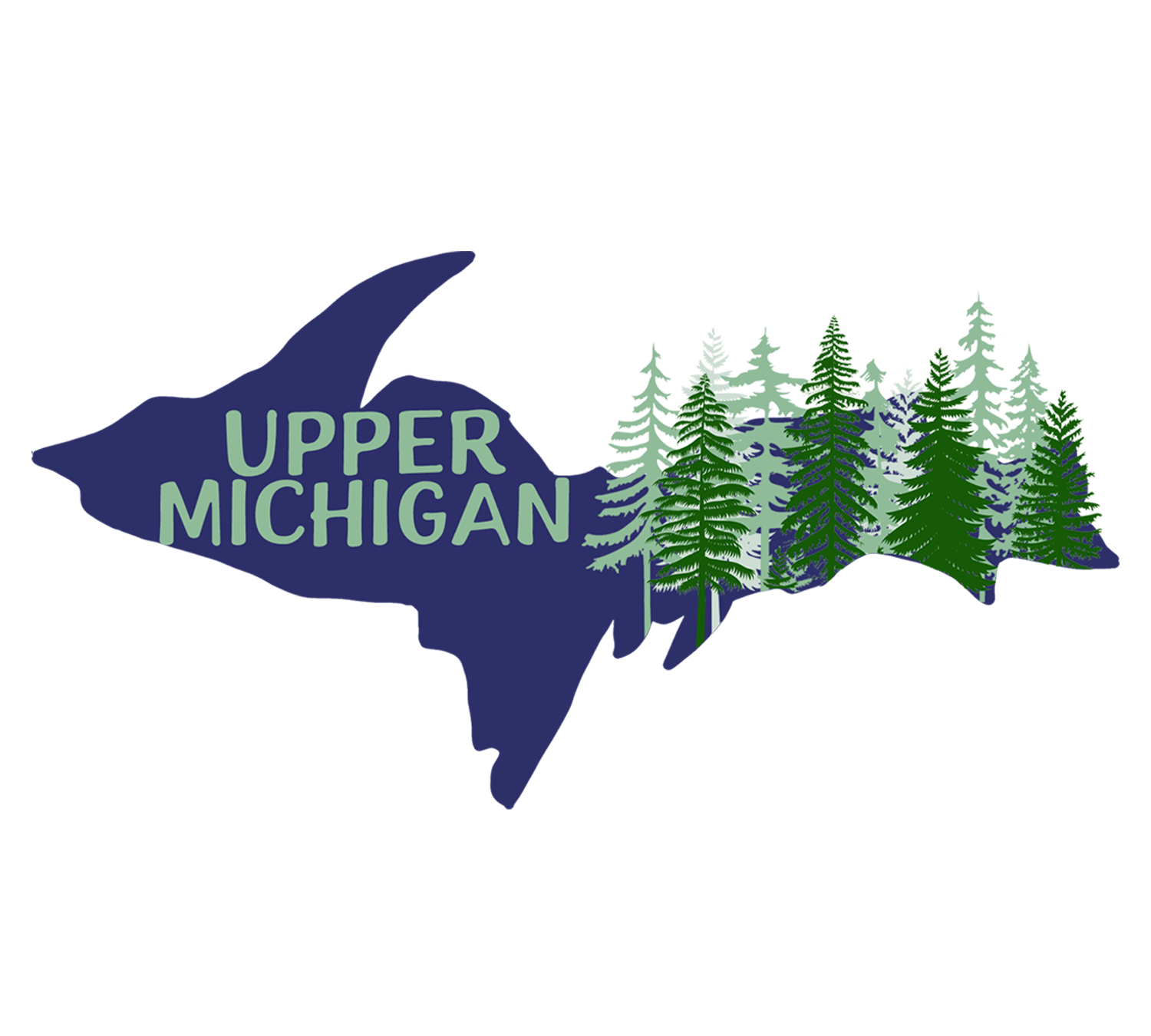 U.P. forest sticker features the words "Upper Michigan" against the shape of the Upper Peninsula along with a grove of pine trees. Much of the U.P. is covered with forests, and that's the way we like it!