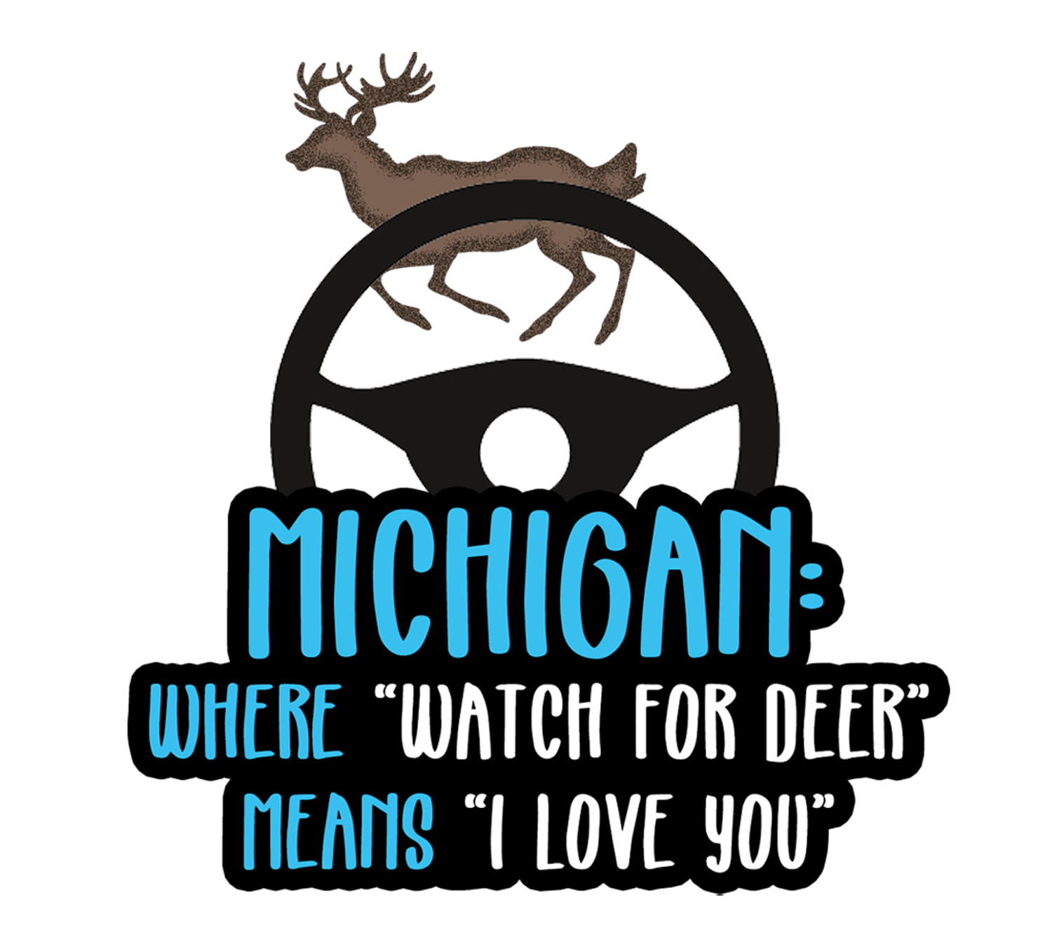 Michigan residents will love this sticker featuring the words "Michigan: Where Watch for Deer Means I Love You" and a buck and steering wheel. Anyone who has hit a deer knows it's something you want to avoid so we warn those we love to be careful.