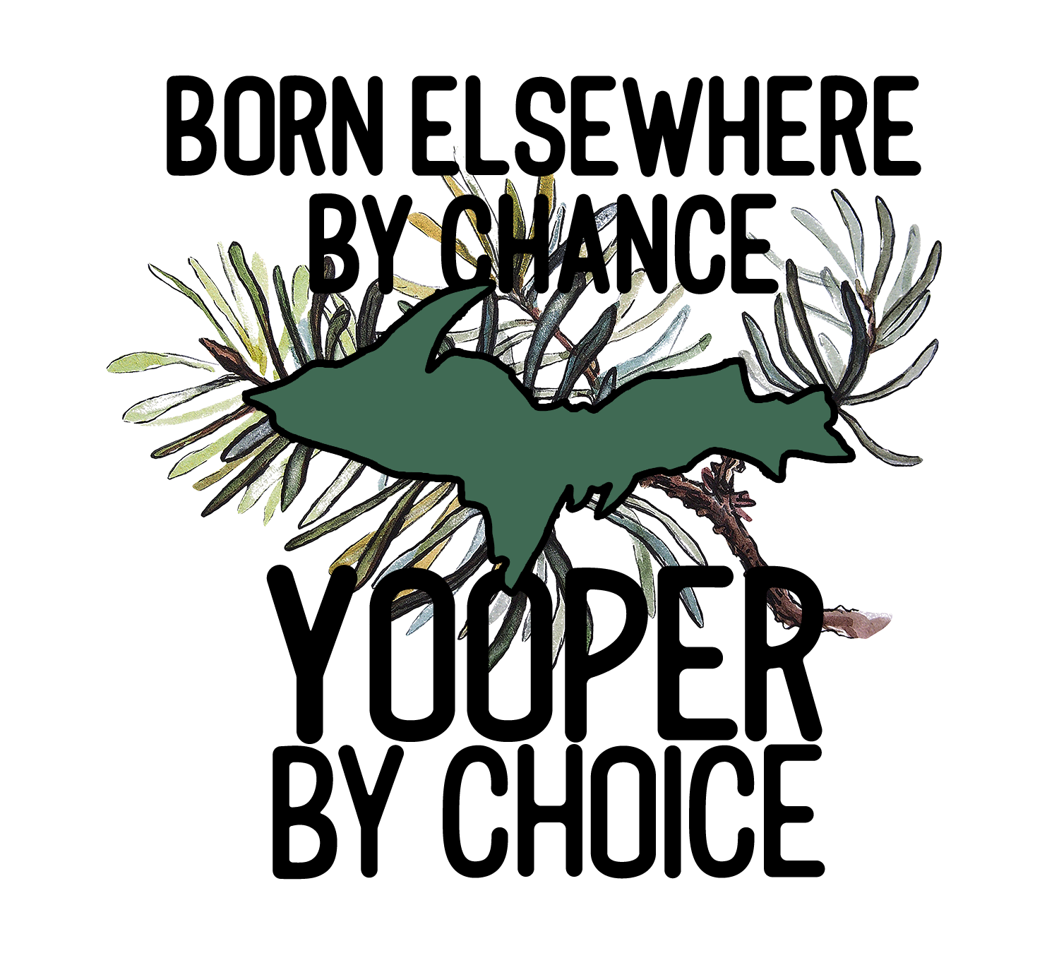 Magnet/sticker features the words "Born Elsewhere By Chance, Yooper By Choice" with pine needles and the shape of the Upper Peninsula of Michigan.