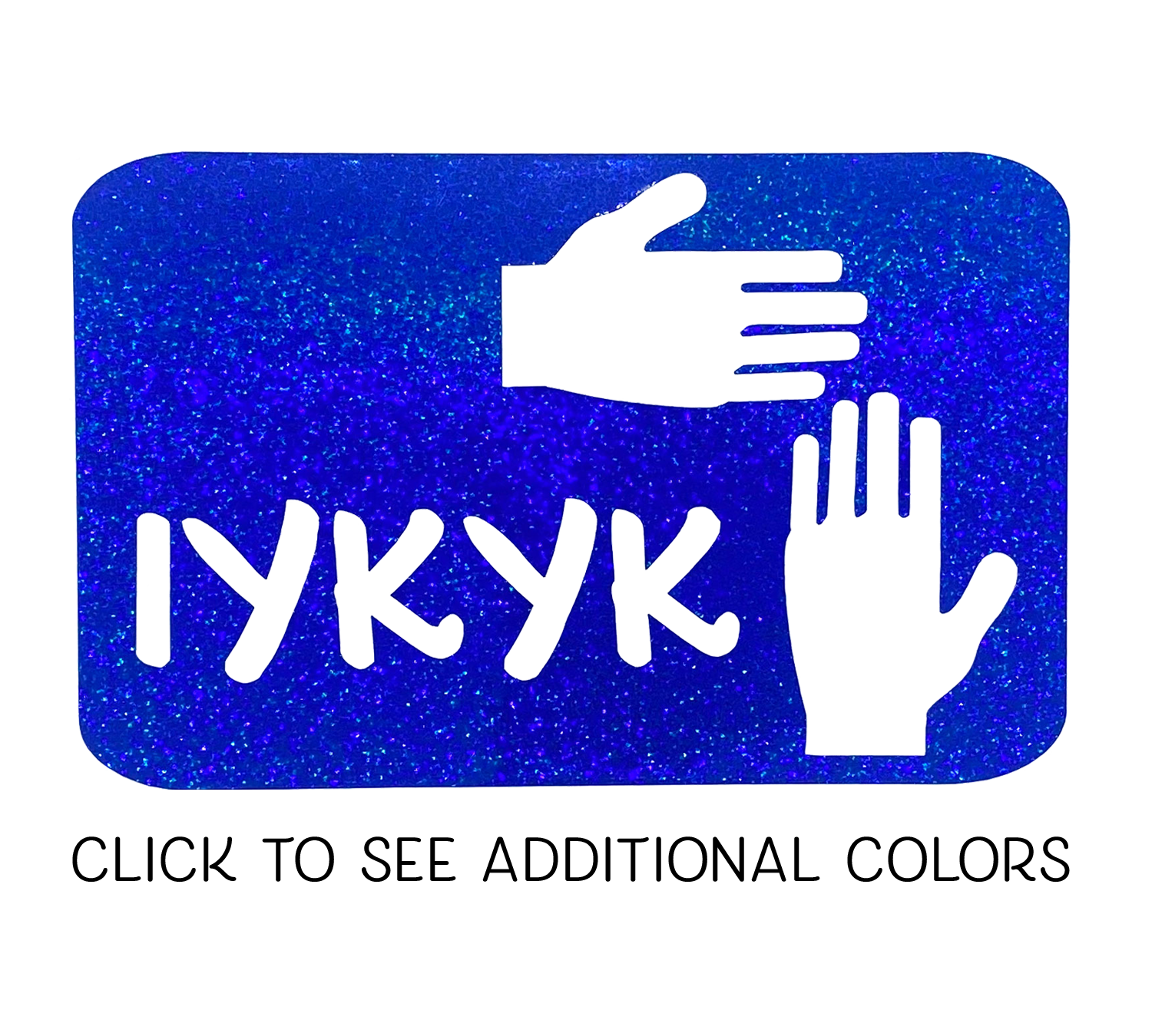 Decal features the letters "IYKYK" in four varieties: royal blue, sky blue, and silver glitter that display a holographic rainbow effect from different angles (see the video to get the full effect of this gorgeous sticker!) and also glossy white.